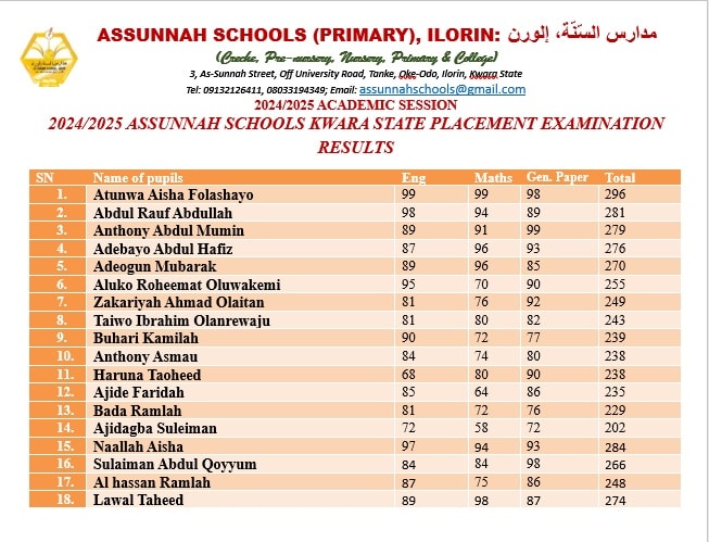 Assalāmu Alaikum WarahmatuLlāhi WabarakātuH With thanks and gratitude to Allah, Assunnah Schools, Ilorin is proud to announce the remarkable performance of our scholars in the recently concluded Kwara State Placement Examination for Primary Schools. One of our outstanding pupils achieved an exceptional score of 296 out of 300, standing as a shining example of the blessing that comes with hard work, dedication, and the pursuit of knowledge guided by Islamic values. This achievement reflects the tireless efforts of our management and staff (most especially their class teacher), whose patience, sincerity, and commitment continue to shape the future of our young learners. We pray that Allah rewards every teacher, coordinator, and member of staff abundantly for their contribution towards nurturing a generation grounded in both academic excellence and piety. As shared by: Mr. Adunola, Upper Basic Coordinator, this milestone is a call to strive further for ihsan (excellence) in all we do, seeking Allah’s pleasure and guidance. May Allah continue to grant success to our scholars and strengthen our efforts in raising knowledgeable and righteous Muslims. Jazakumullahu Khairan. KAMALDEEN LukmanFor: Management,Assunnah Schools,Β Ilorin. https://www.facebook.com/100070029525709/posts/pfbid0Q52fnNr4YGToc4NcfDmLeaSb6eqSXX79c5pETkvkfikns2fwccLJKdsaAHZr1v4Jl/?sfnsn=wa